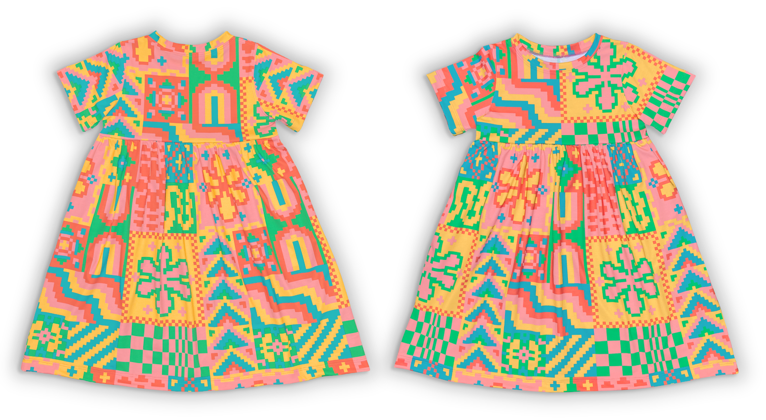 Back and front of a dress made from the Pixel Stitch pattern, a pixelated block pattern made from panels of designs including wavy stripes, rainbows, flowers, and checkerboards, in a neon pastel color palette in sky blue, blush pink, emerald green, watermelon red, and sunny yellow.